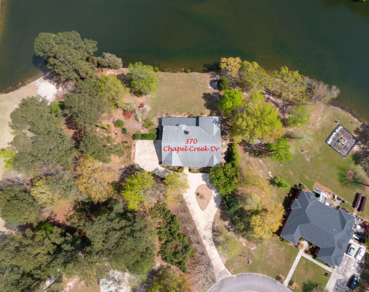 Exquisite Custom Home with Golf and Pond Views in Desirable Chapel Creek. Welcome to 370 Chapel Creek Drive, a magnificent 4-bedroom, 4-bathroom brick home with 3,720 sq ft on a spacious .81-acre lot, perfectly positioned within the Chapel Creek community in Santee, SC. This stunning home offers a blend of luxurious living, exceptional privacy, and unparalleled access to the area's finest recreational amenities. The curb appeal begins with a stately circular driveway, and maintained mature landscaping. Impressive double front doors open into a grand, light-filled foyer with a view of the home's open concept living with soaring ceilings, creating an atmosphere of sophistication and comfort. The gourmet kitchen is a dream, featuring an island, crisp white cabinetry, elegant stone countertops, custom tiled backsplash, floating shelves and high-end stainless-steel appliances, all complemented by a separate, well- appointed pantry/coffee bar. The kitchen flows seamlessly into the spectacular great room, where cathedral ceilings and abundant natural light highlight the focal point fireplace and view. This generous space effortlessly accommodates both a formal living area and a large dining space, perfect for hosting family and guests. The main level offers luxurious living; including a spacious primary suite which is a true retreat, featuring sliding glass doors that open directly to the back deck, offering serene views of the adjacent pond. The private en-suite includes a luxurious stand-alone jetted tub, a dual sink vanity, and a large, tiled walk-in shower. Two additional generously sized bedrooms are located on the main floor. A large guest bedroom is situated next to a full bath with a tub/shower combo, while a second spacious guest suite enjoys access to another full bathroom with dual vanities and a tub/shower combo. The substantial laundry room is highly versatile, easily functioning as a mudroom, home office, or storage area, and provides convenient access to the back deck. The upper level features a fourth large bedroom complete with its own private full bathroom, offering an ideal space for a secluded guest suite or a bonus room. Outdoor living is maximized by a huge back deck with stunning pond and partial golf course views. A section of the deck is covered, providing an ideal spot for year-round enjoyment, with the space underneath offering an additional covered patio area. The expansive backyard, bordered by mature trees, ensures a high degree of privacy. The 2.5 car garage is oversized, providing ample storage and the perfect designated space for a golf cart, a necessity for the nearby world-class golf courses. Location, Location, Location! Chapel Creek is renowned for its tranquil setting and proximity to premier recreational opportunities. Enjoy immediate access to Santee's renowned golf courses, including the Santee Cooper Country Club. Furthermore, you are mere moments from Lake Marion, South Carolina's largest lake, offering endless boating, fishing, and water sport activities. Santee State Park is also nearby, providing trails, camping, and nature immersion. This prime location delivers the ultimate low-country lifestyle, balancing luxury living with outdoor adventure.
